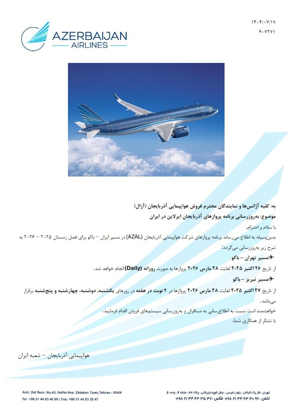 بخشنامه و اطلاعیه هواپیمایی آذربایجان درباره به روز رسانی برنامه پروازهای آذربایجان ایرلاین در ایران 477271