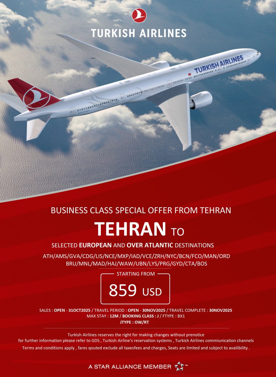 بخشنامه و اطلاعیه هواپیمایی ترکیش درباره نرخ ویژه پرواز از تهران با هواپیمایی ترکیش
