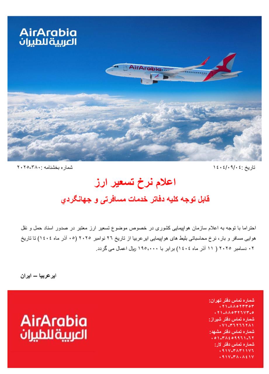 بخشنامه و اطلاعیه هواپیمایی ایرعربیا درباره اعلام نرخ تسعیر ارز هواپیمایی ایرعربیا از 26 نوامبر تا 02 دسامبر 2025