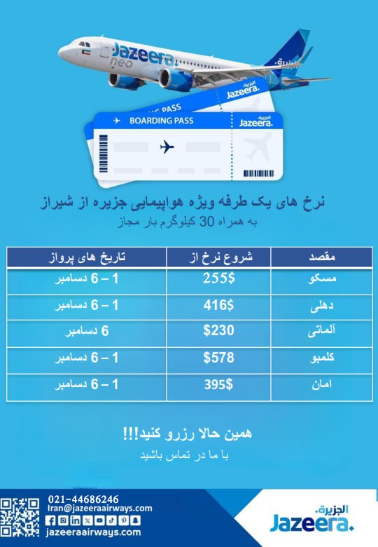 بخشنامه و اطلاعیه هواپیمایی جزیره درباره نرخ های یک طرفه ویژه هواپیمایی جزیره از شیراز