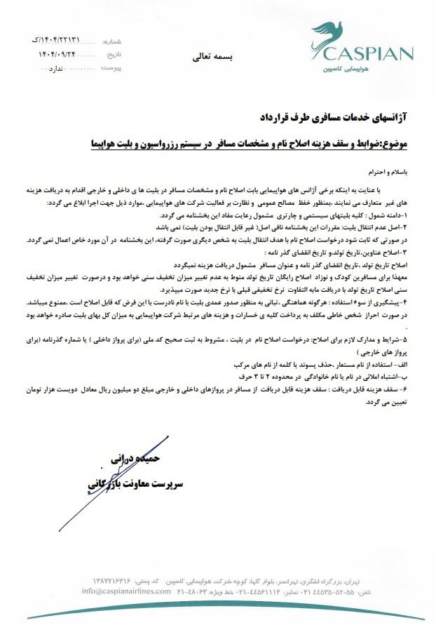 بخشنامه و اطلاعیه هواپیمایی کاسپین درباره ضوابط و سقف هزینه اصلاح نام و مشخصات مسافر در سیستم رزرواسیون و بلیت هواپیما IV 22131