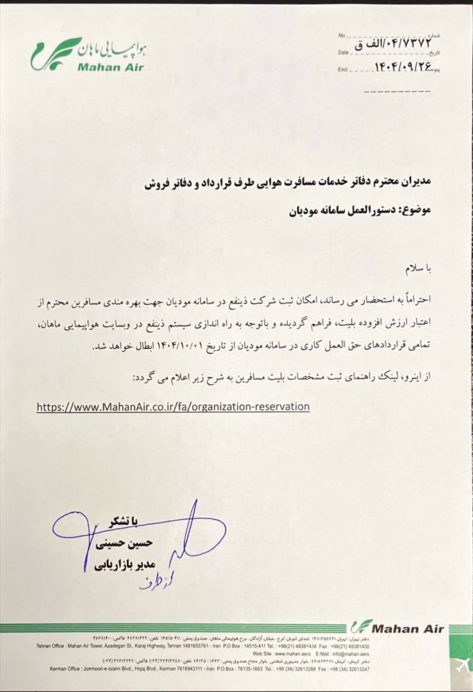 بخشنامه و اطلاعیه هواپیمایی ماهان درباره دستورالعمل سامانه مودیان w5 7372