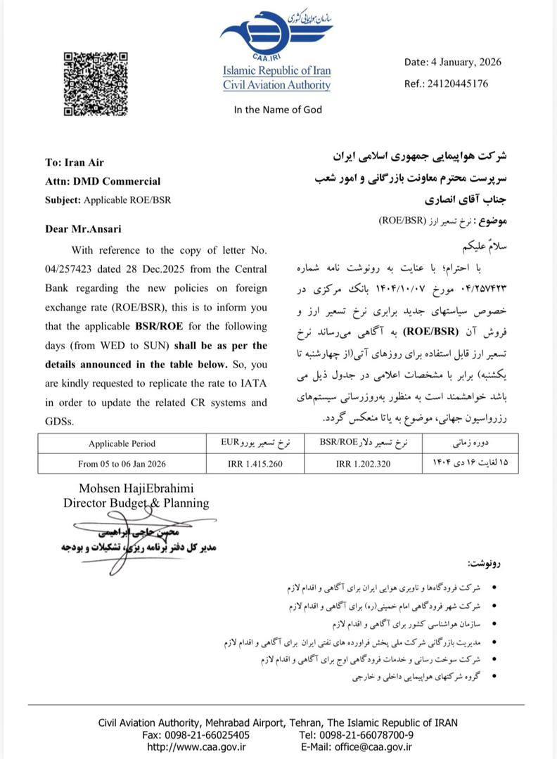 بخشنامه و اطلاعیه سازمان هواپیمایی درباره نرخ تسعیر ارز (ROE/BSR) 24120445176