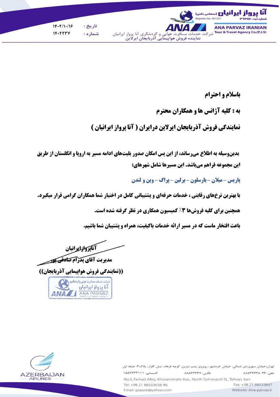 بخشنامه و اطلاعیه هواپیمایی آذربایجان درباره نمایندگی فروش هواپیمایی آذربایجان در ایران 1404237