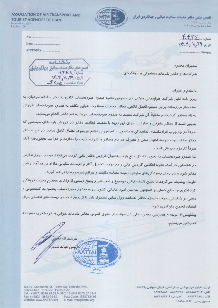بخشنامه و اطلاعیه انجمن ایران درباره رویه صدور صورت حساب پیرو نامه اخیر هواپیمایی ماهان
