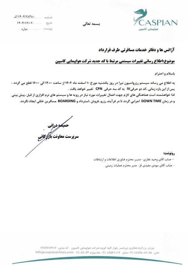 بخشنامه و اطلاعیه هواپیمایی کاسپین درباره اطلاع رسانی تغییرات سیستمی مرتبط با کد جدید شرکت هواپیمایی کاپسین IV 28380